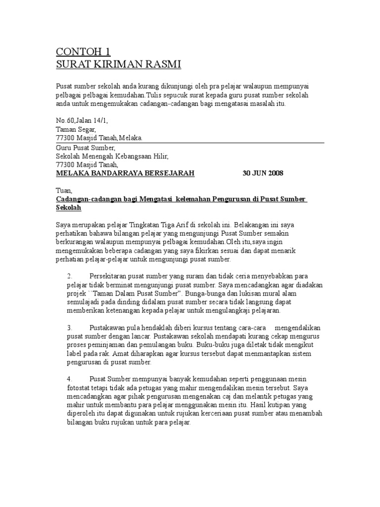 Contoh Surat Kiriman Rasmi from reader015.docslide.net Ia dihantar kepada orang yang tidak semestinya diketahui oleh kita dalam dalam format surat rasmi, kata panggilan yang digunakan hanyalah tuan untuk lelaki dan puan untuk perempuan. Diberikan di bawah boleh dijadikan sebagai rujukan dan panduan bagi para pelajar pt3 untuk menulis karangan surat kiriman tidak rasmi yang terbaik dari segi kualiti dan mutunya mengikut format yang telah ditetapkan. Berikut dikongsikan contoh surat kiriman rasmi beserta format buat panduan mereka yang memerlukannya termasuk ibu bapa dan pelajar. Contoh surat kiriman tidak rasmi(surat ke pulau langkawi via dokumen.tips. Surat kiriman rasmi mempunyai format yang sangat berbeza dengan format kiriman tidak rasmi. Contoh format surat kiriman rasmi via www.scribd.com. Format surat rasmi merupakan surat bersifat formal dan ditulis untuk kepentingan umum. Pernahkah kamu menghubungi mereka ?